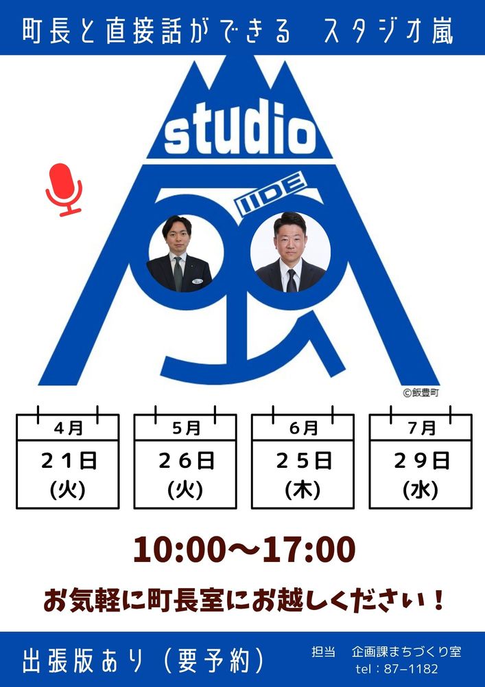 飯豊町では、町民の声を聴き町政に反映させるための広聴業務を「スタジオ嵐」として、令和7年度から開催しています。スタジオ嵐では、嵐町長自ら皆さまの声をお聴きします!日ごろ感じていることや考えていることを町長にお話してみませんか?