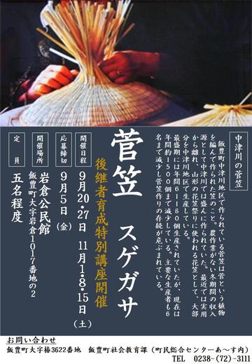最盛期には16,180個生産されていましたが現在は約1,500個まで減少しています。主要な生産者も6名まで減少し、菅笠作りの存続が危ぶまれているため、後継者育成特別講座を下記の通り開催します。
